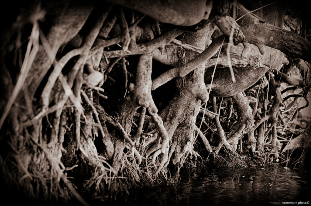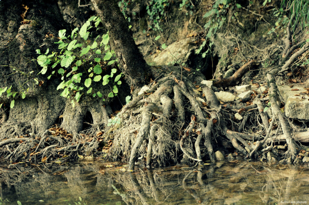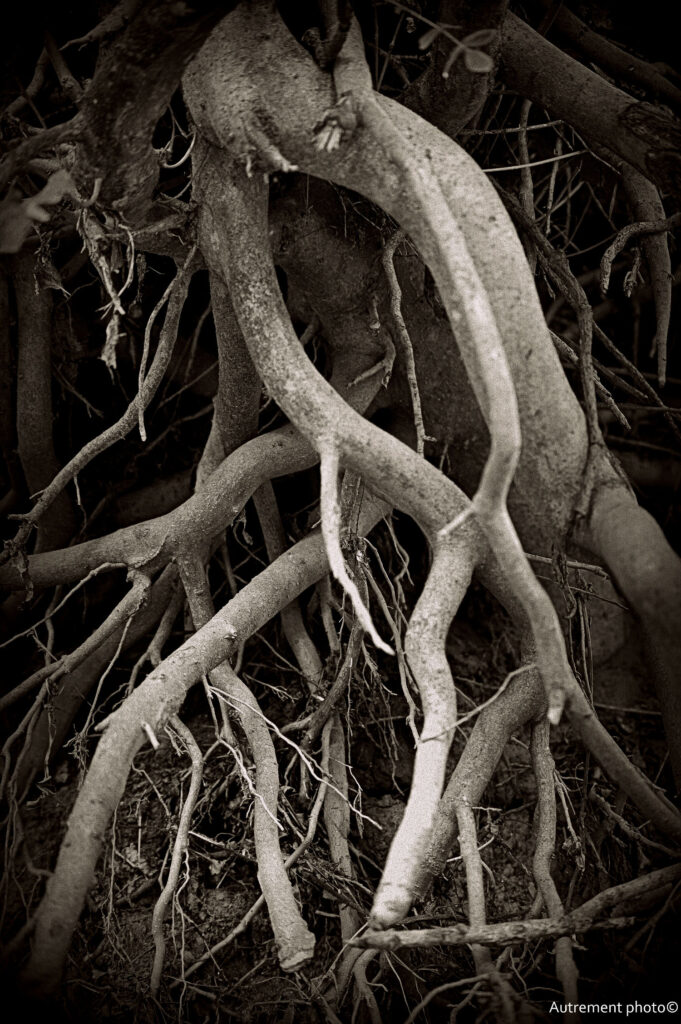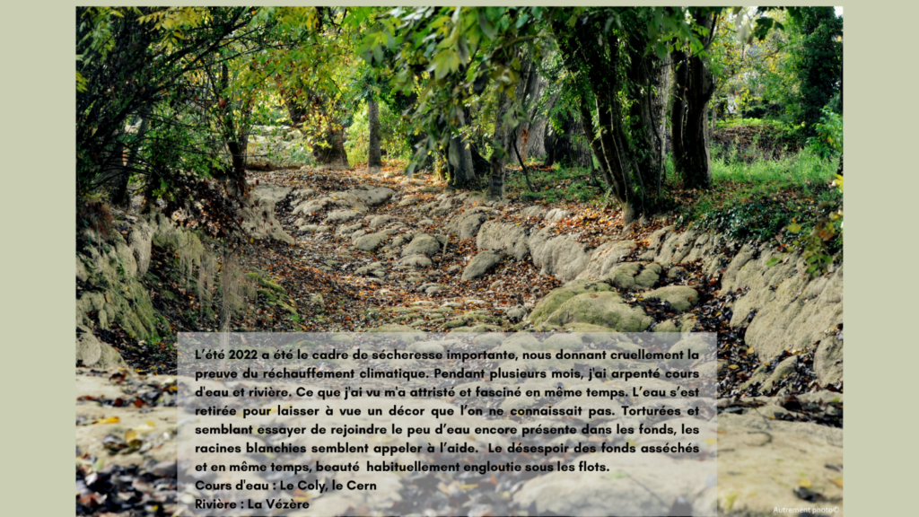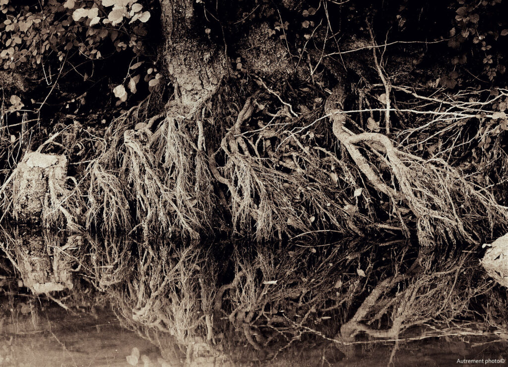 L’été 2022 a été le cadre de sécheresse importante, nous donnant cruellement la preuve du réchauffement climatique. Pendant plusieurs mois, j’ai arpenté cours d’eau et rivière. Ce que j’ai vu m’a attristé et fasciné en même temps. L’eau s’est retirée pour laisser à vue un décor que l’on ne connaissait pas. Torturées et semblant essayer de rejoindre le peu d’eau encore présente dans les fonds, les racines blanchies semblent appeler à l’aide. J’ai voulu montrer le désespoir qui ressortait de ces fonds asséchés et en même temps montrer une beauté qui habituellement se cache sous les flots.